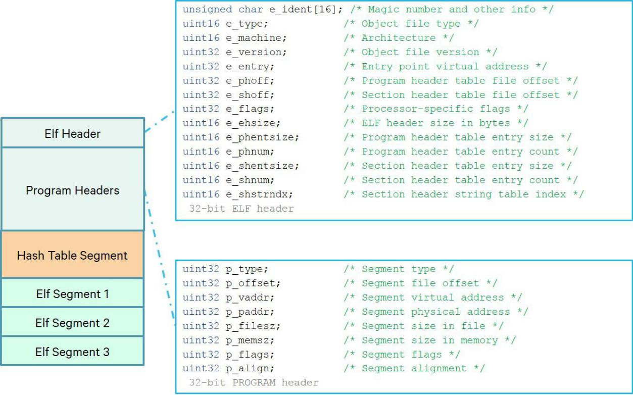 ELF 标头主要用于定位 ELF 镜像文件中的程序标头。程序标头包含 ELF 镜像文件中所有段的位置,特别是用于定位 ELF 文件中的哈希段,其中包含用于验证 ELF 镜像的验证信息。