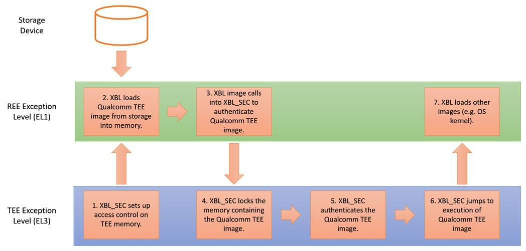 - 一个用于协调加载可信执行环境(TEE,Trusted Execution Environment)的高度可信的安全扩展引导加载程序(XBL_SEC)。这包括 Qualcomm® 可信执行环境(Qualcomm TEE)镜像和相关镜像。