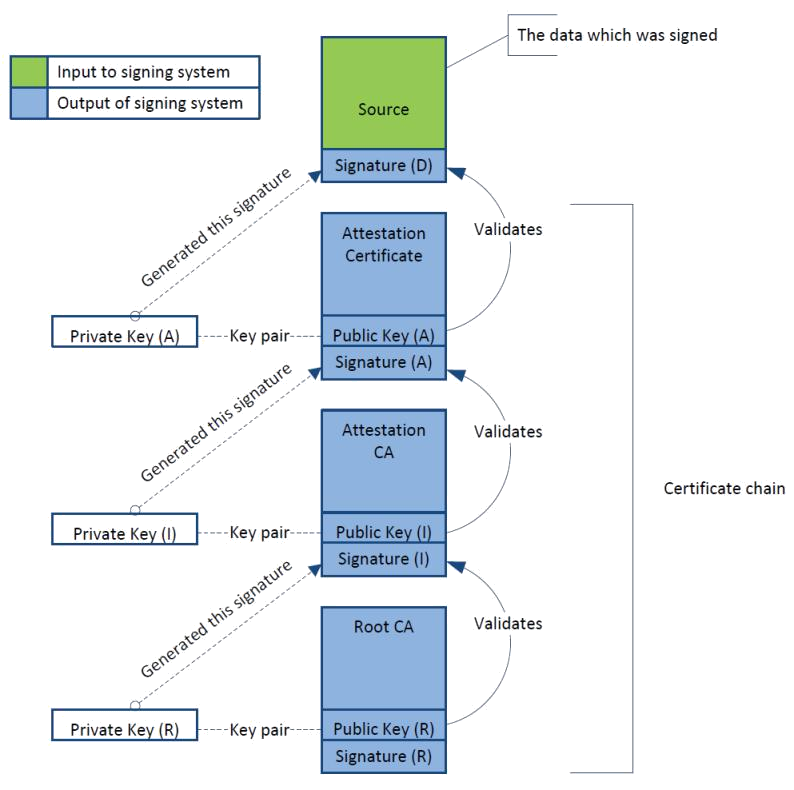 哈希段还包含 X509 证书(Certificate)链和验证哈希表和镜像元数据的数字签名。链中的第一个 X509 证书(称为根证书)根据烧录到硬件中的值进行验证,并且每个后续证书都根据先前的证书进行验证。这个 X509 证书链最终验证了一个用于验证数字签名的公钥(Public Key),这证明了哈希表和镜像元数据的正确性。